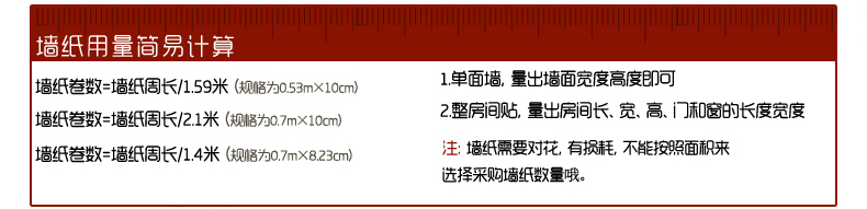 1.所需壁紙的總幅數=要粘貼壁紙牆麵的長度÷壁紙寬度;